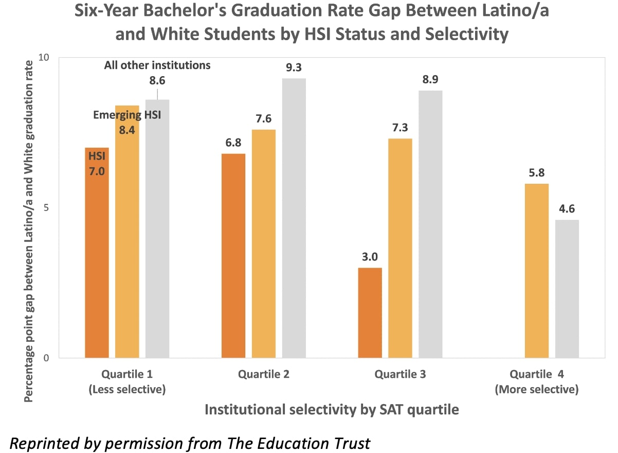 Education Trust analizó la tasa de graduación en carreras de grado en un período de seis años entre estudiantes latinos y blancos con niveles similares de preparación académica, calculando la diferencia promedio entre ambos grupos en HSIs, eHSIs y otras instituciones (ver gráfico 1). El organismo concluyó: “en universidades menos selectivas y moderadamente selectivas (donde las tasas de finalización para estudiantes latinos tienden a ser más bajas), las eHSIs suelen tener brechas menores en las tasas de graduación entre latinos y blancos que las instituciones con pocos latinos —lo que sugiere que una matrícula latina más alta en el campus puede conducir a resultados más equitativos”.