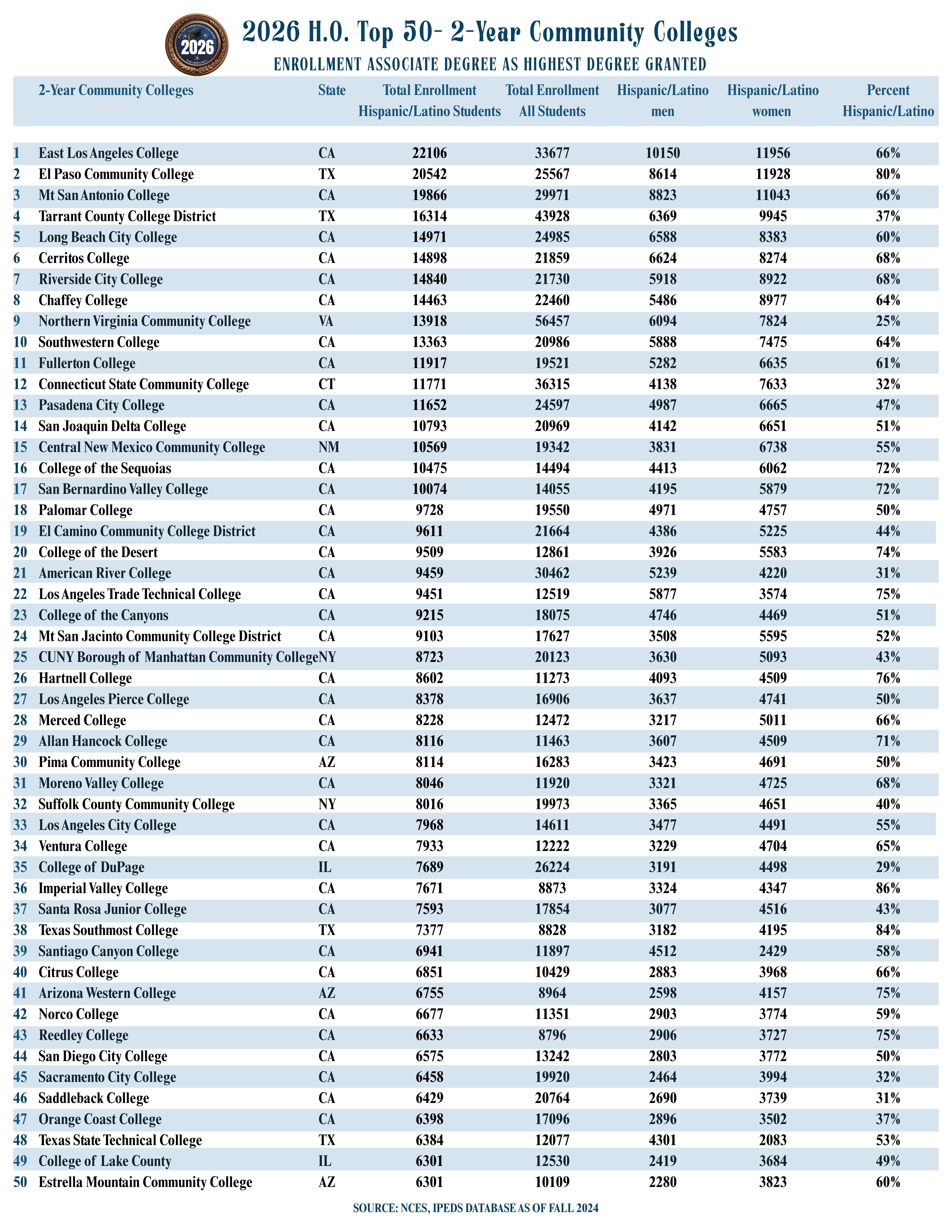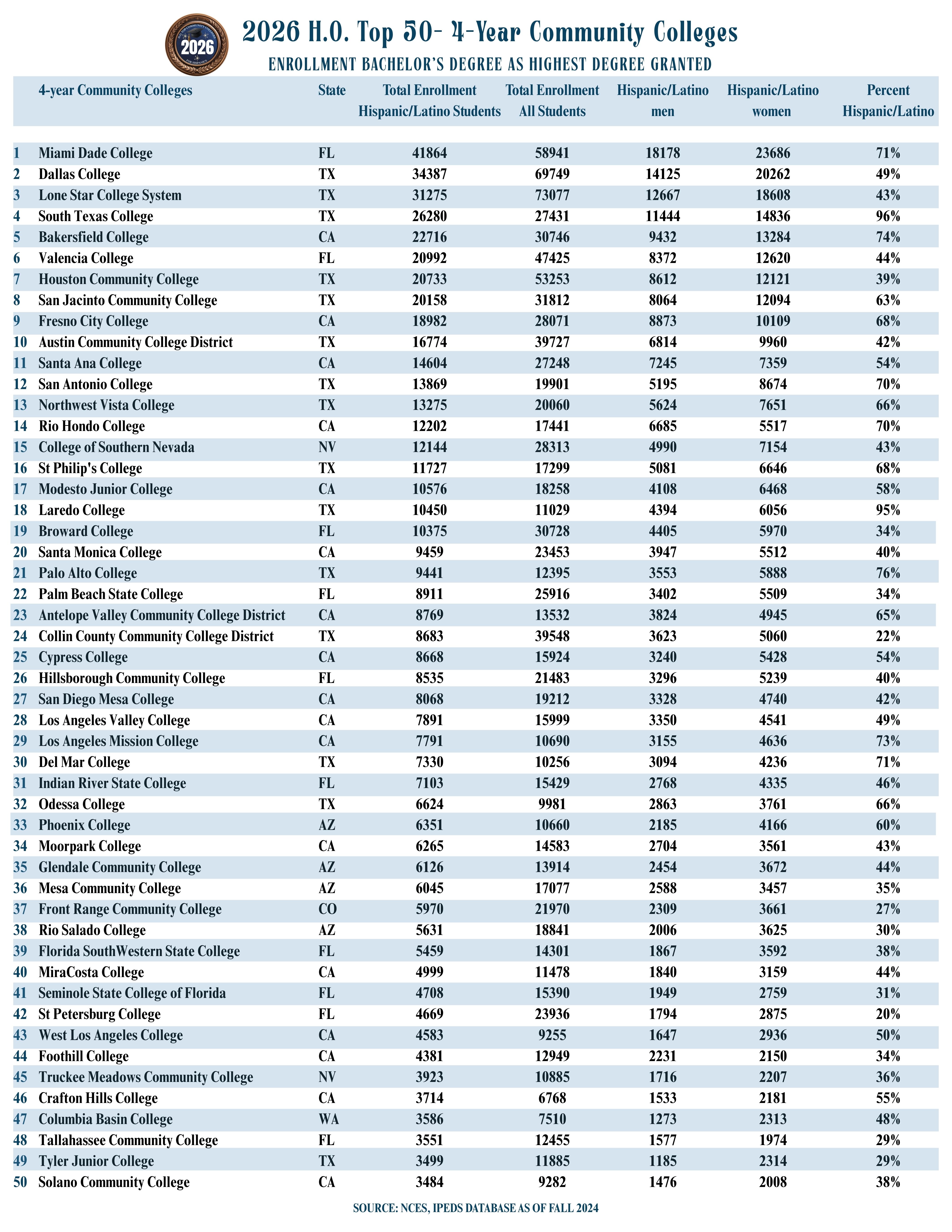 Community colleges are essential for the advancement of hundreds of thousands of students across the country, due to their affordability, emphasis on workforce development, flexibility, and holistic support services for diverse groups of learners. These institutions are particularly important for the large proportion of Hispanic/Latino students who begin their higher education studies here, accessing wider opportunities from this base. Thus, Hispanic Outlook emphasises community colleges’ invaluable support every year, by recognizing those that serve the largest number of Hispanic/Latino students (measured through enrollment and degrees granted). In order to identify these top 50 community colleges, we draw upon the latest data (Fall 2024 for enrollment, and 2023-24 academic year for degrees granted) provided by the Integrated Postsecondary Education Data System (IPEDS), a part of the National Center for Education Statistics (NCES).