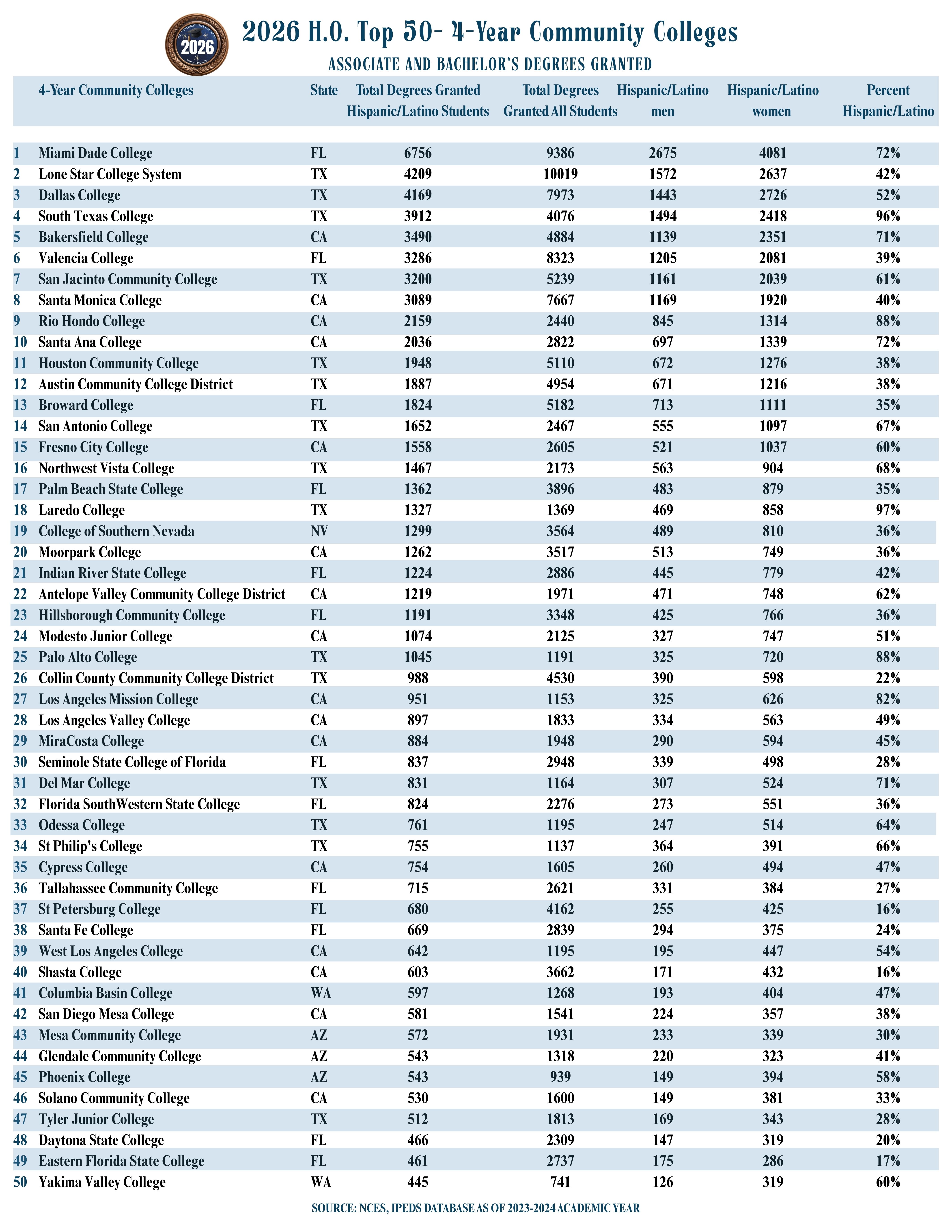 - Among four-year community colleges, Miami Dade College ranks first in awarding the greatest number of Associate and Bachelor’s degrees to Hispanic/Latino students, with 6,756. The Lone Star College System, Dallas College, South Texas College and Bakersfield College round out the top five places on this list; each of these colleges awarded more than 3,400 of these degrees to Hispanic/Latino students.