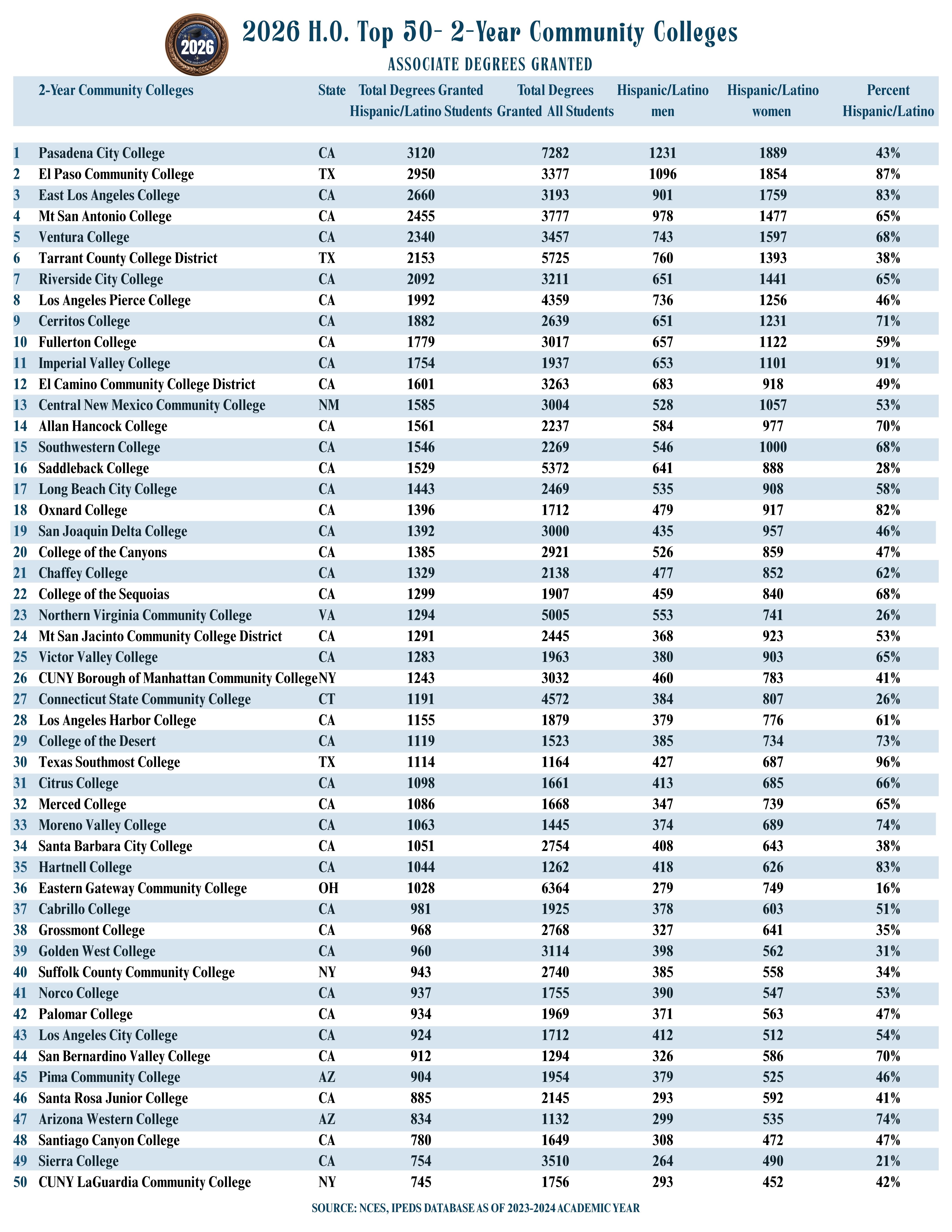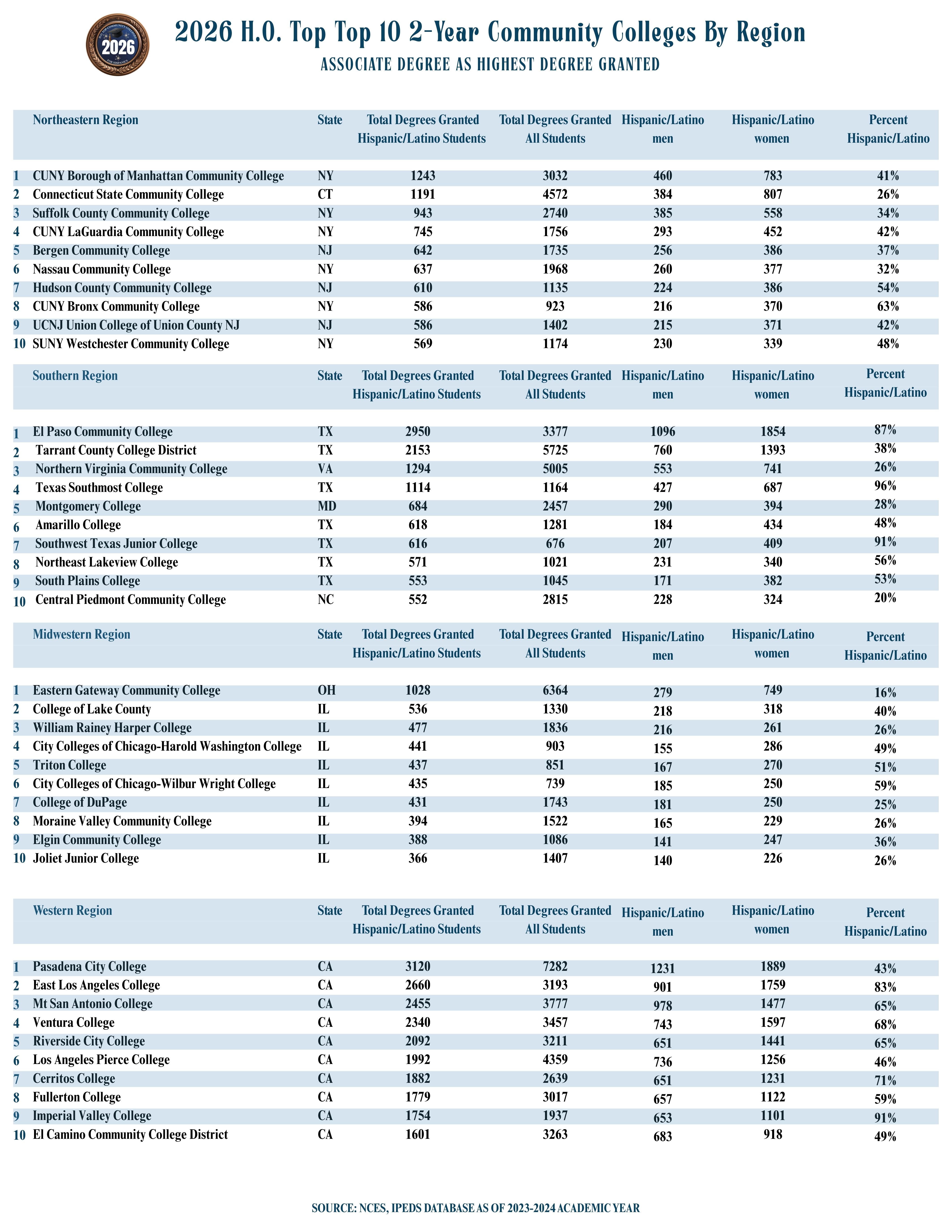 - Regionally, the data on Associate’s degrees granted by two-year institutions to Hispanic/Latino students reveals that El Paso Community College in Texas is ranked first in the South, the largest region in the country (comprised of 17 states). In the West, Pasadena City College in California is in first place, while in the Midwest Eastern Gateway Community College in Ohio ranks first, and in the Northeast, CUNY Borough of Manhattan Community College in New York awards the highest number of these degrees to Hispanic/Latino students.